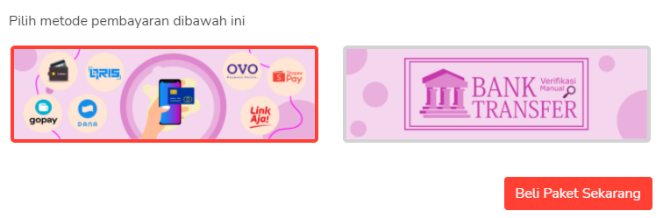 Anda dapat memilih metode pembayaran yang diinginkan, apakah menggunakan QRIS/E-Wallet (mendukung pembayaran QRIS menggunakan bank dan E-wallet apapun) atau menggunakan metode transfer bank. Untuk metode transfer bank akan dilakukan verifikasi manual sehingga akan ada jeda waktu hingga paket yang Anda beli akan aktif. Setelah Anda memilih metode pembayaran klik tombol beli paket sekarang.