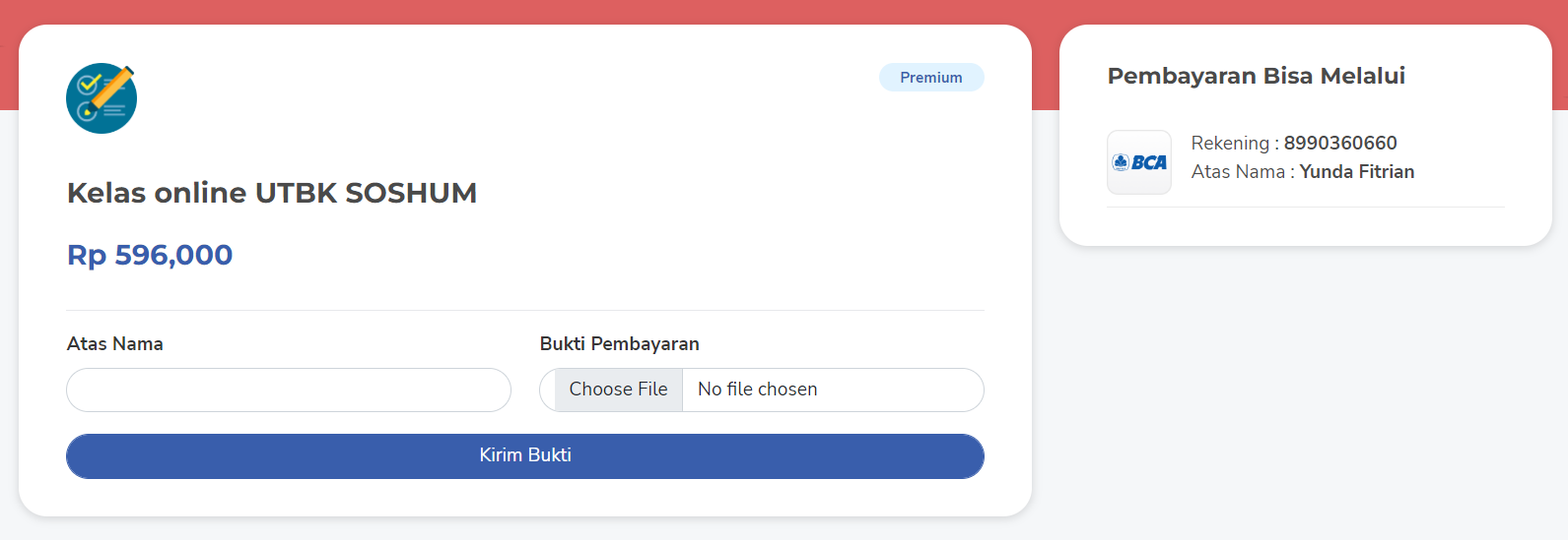 Bila Anda menggunakan Metode Transfer Bank, lihat kembali rincian pembelian dan Anda dapat melakukan pembayaran sejumlah tagihan melalui Bank BCA yang tertera pada halaman dan mengupload bukti pembayaran pada form yang diberikan.
